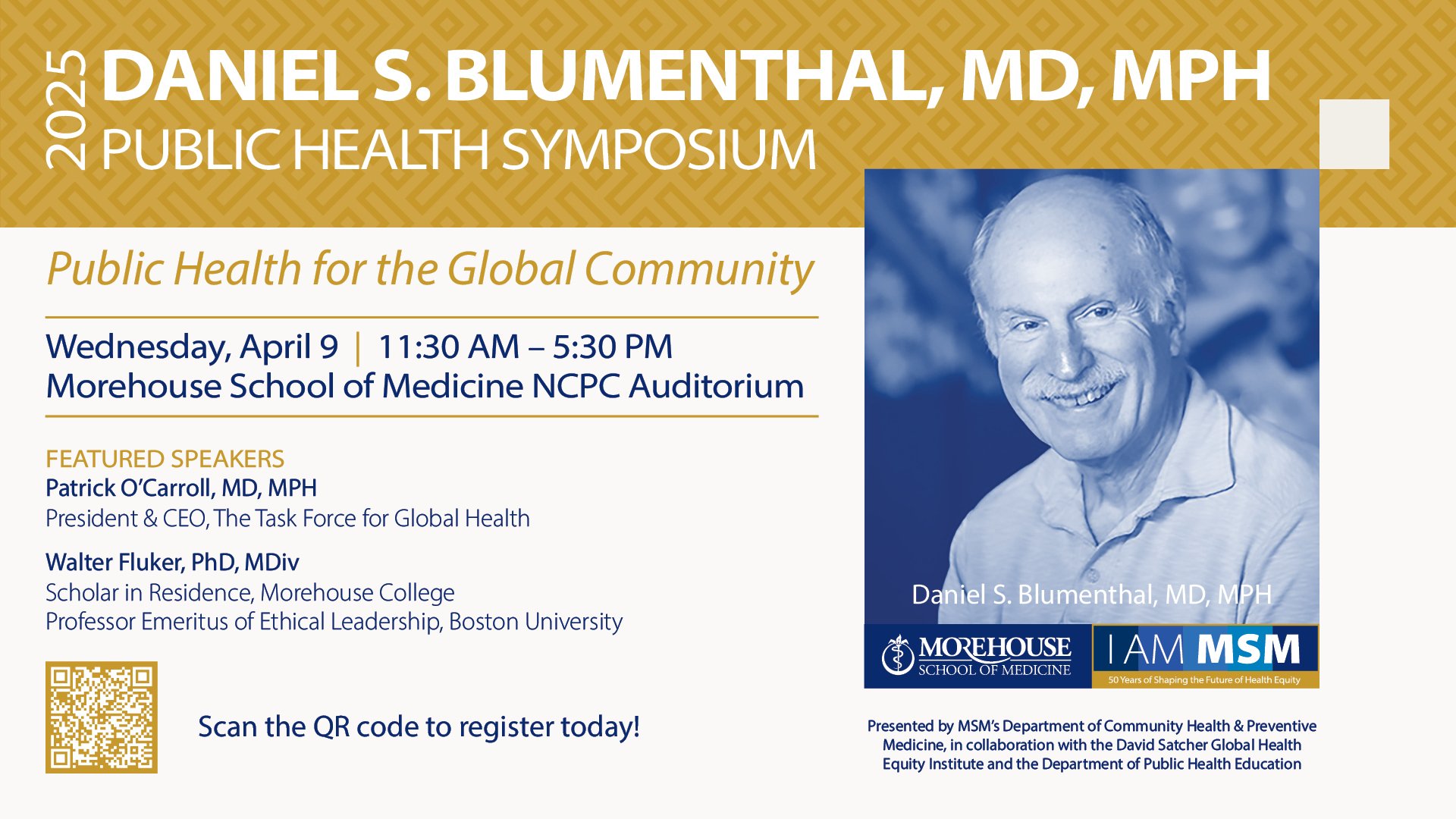 This endowed symposium honors the legacy of Daniel Sender Blumenthal, MD, MPH, who devoted almost 40 years teaching medical and other health professionals how to properly treat and care for disadvantaged underserved populations. He was unwavering in his commitment to empowering communities and worked tirelessly in Georgia’s rural and local Atlanta communities to bring quality healthcare services, research, and resources to some of the state’s most impoverished areas. Although he retired from the medical school in 2014, he continued to work with MSM as Professor and Chair Emeritus of the Department of Community Health and Preventive Medicine until the final day of his life.