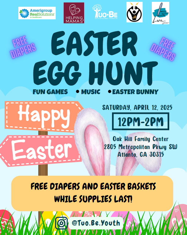 We are excited to announce our Annual Easter Egg Hunt will be on Saturday, April 12, 2025, from 12:00pm to 2:00pm at Oak Hill Child, Adolescent &Family Center located at 2805 Metropolitan PKWY SW Atlanta, GA 30315. We are excited to provide another opportunity to serve our community and families with a fun filled day of music, dancing, giveaways and easter egg hunt on the field! If you, friends, or family are planning on attending, please complete registration by clicking this link. Your presence will make the difference when we serve the community around us.