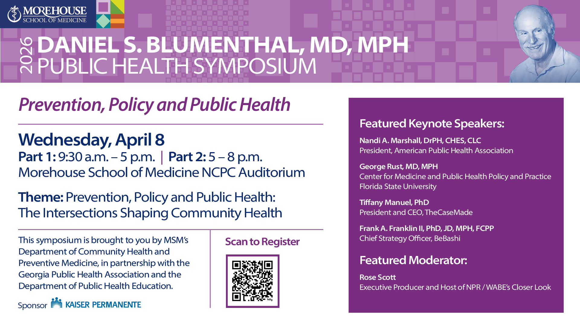 Join us on Wednesday, April 8th from 9:30 A.M. to 5:00 P.M. ET in the NCPC Auditorium at Morehouse School of Medicine for the annual Daniel S. Blumenthal Public Health Symposium.