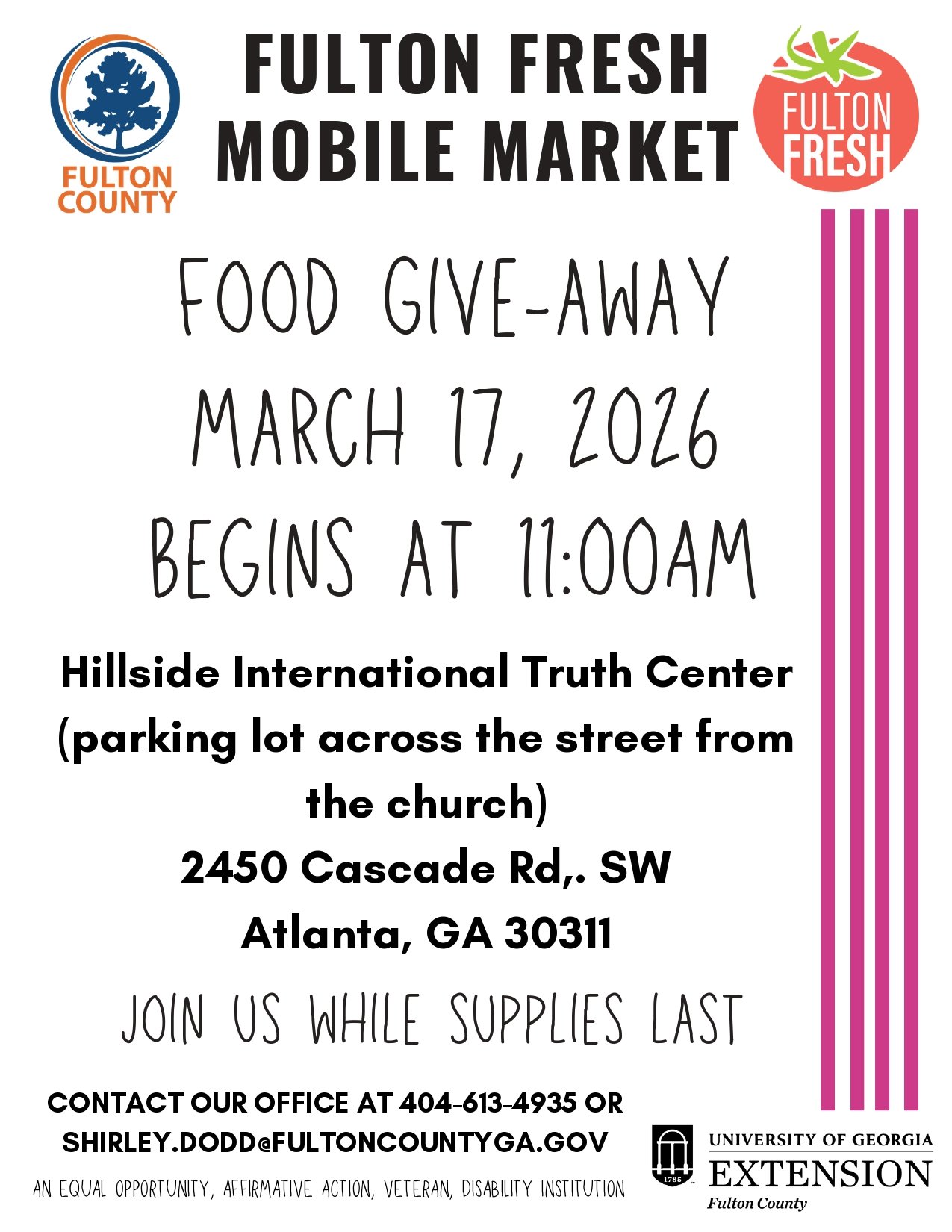 The Fulton Fresh mobile market will be distributing a FREE food giveaway to the community! Learn more about this amazing initiative that is hosted by the Fulton County and University of Georgia Extension partnership by clicking here!